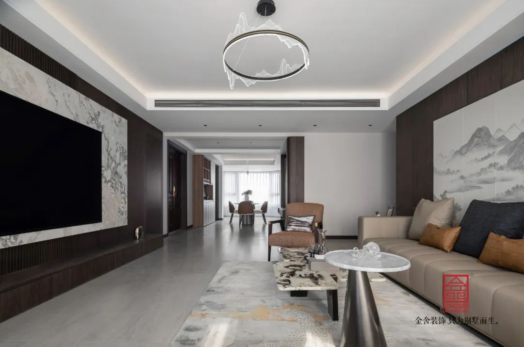 深色的墻板與大理石的配合,讓兩種不同明暗的材質(zhì)在同一空間出現(xiàn)激情的碰撞,明暗蜿蜒的大理石紋理,也讓整個(gè)空間出現(xiàn)了一種流動(dòng)感。沙發(fā)背景墻采用水墨山水的背燈硬包,讓空間增加了一份東方意味。