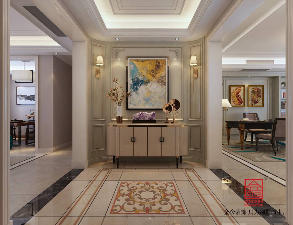 設計說明:此案例為石家莊金舍裝飾-榮盛華府200平米混搭風格裝修效果圖。傳統(tǒng)的客廳以電視墻為主導,沙發(fā)和茶幾的高度往往相差不大,這樣的高度差對于孩子寫作業(yè)或是成年人看書寫字和使用電腦是沒有舒適度可言的,因此一些有工作和學習需求的家庭可以考慮把家庭工作室融入客廳,利用靠墻的大操作臺和各種墻面擱板架,滿足多人工作的需求